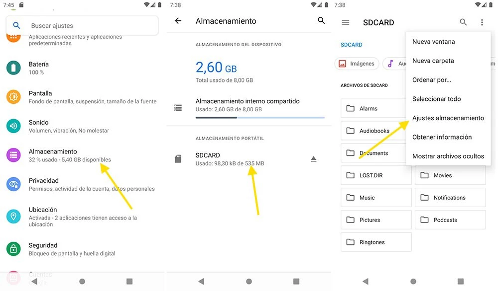 Para formatear la tarjeta MicroSD de un móvil Android, deberás ir a los ajustes del sistema y tocar en Almacenamiento. Toca entonces en el nombre de la tarjeta MicroSD en el apartado Almacenamiento portátil. En el gestor de archivos que se abre, toca en el botón de menú ⋮ y elige Ajustes almacenamiento.