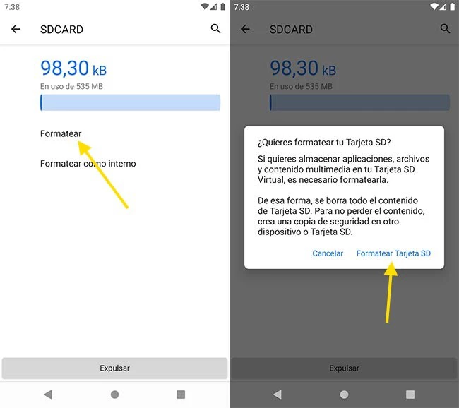 Si quieres formatear la tarjeta para que siga siendo independiente del móvil (es decir, que la puedas sacar y usar en otros dispositivos), toca entonces en Formatear. Se mostrará entonces una ventana de confirmación donde debes pulsar de nuevo en Formatear Tarjeta SD.