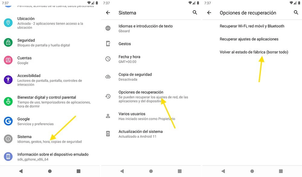 Para formatear el almacenamiento interno de un móvil Android, debes entrar en los Ajustes y tocar en el apartado Sistema. Entra entonces en Opciones de recuperación y pulsa Volver al estado de fábrica (borrar todo). Ten en cuenta que las distintas capas de personalización pueden llamar la opción de forma ligeramente distinta o cambiarla de sitio.