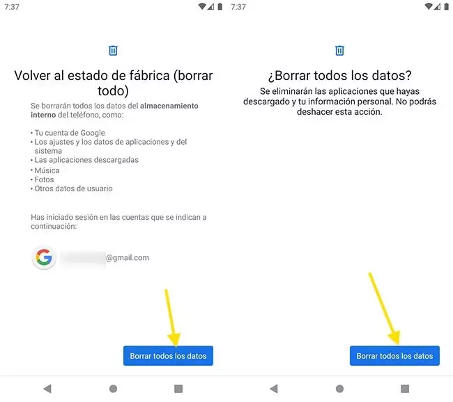 Si vas a vender el móvil, es recomendable que quites la cuenta de Google antes de continuar, pues se pedirá que inicies sesión al volver a configurar el terminal como medida de protección. Si lo vas a seguir usando tu mismo y la ibas a configurar igual, entonces no es necesario: pulsa Borrar todos los datos.