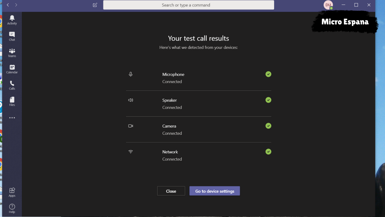 Prueba: Haz una llamada de prueba en Teams (Configuración > Dispositivos > Hacer una llamada de prueba).