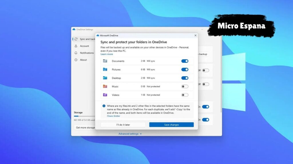 Durante la configuración inicial, OneDrive solicita permiso para proteger las carpetas principales del sistema. Aceptar esta opción activa automáticamente la copia de seguridad de archivos importantes.